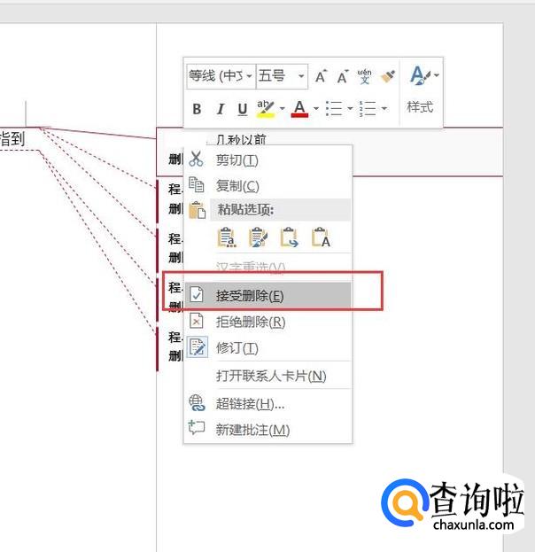 如果我们接受其他人的修订记录,可以对着修订记录击右键,选择“接收修订”选项,然后此项修订内容即可消除,但是修订记录还是存在。