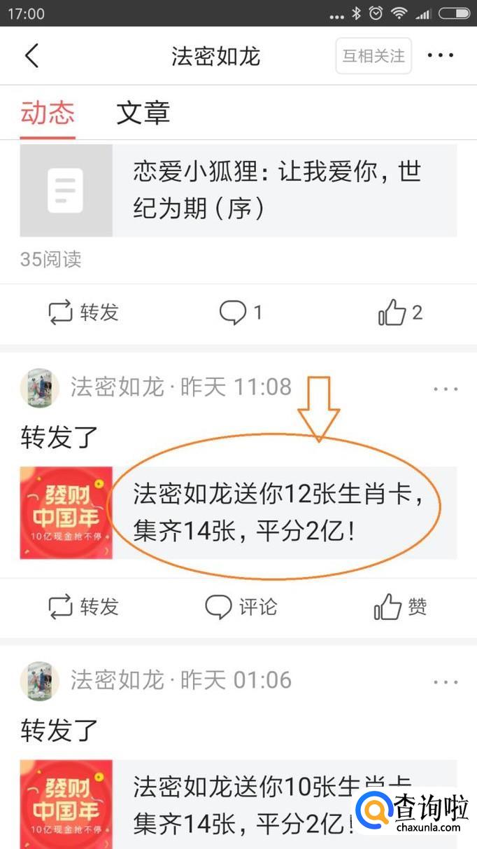 既然你的卡可以分享给别人,当然也可以从别人那里得到他重复的生肖卡。可以多关注朋友的动态信息,