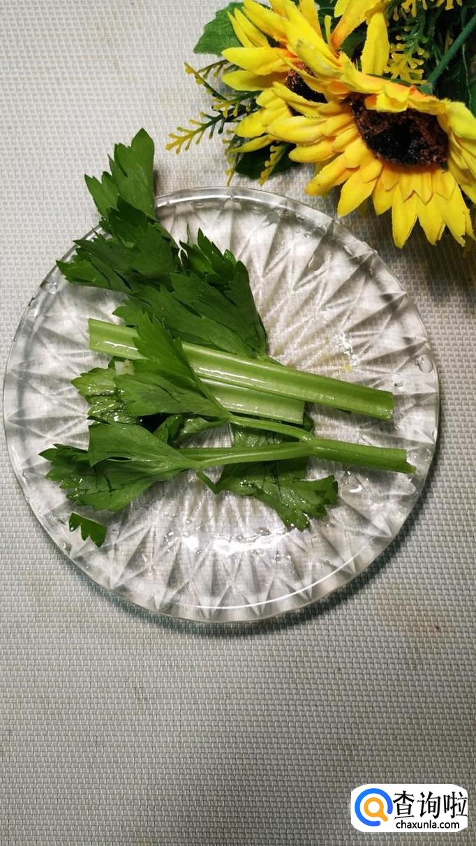 准备适量新鲜的芹菜,叶子不用去掉,将芹菜切碎后放入鸡蛋液中,搅拌均匀,备用。