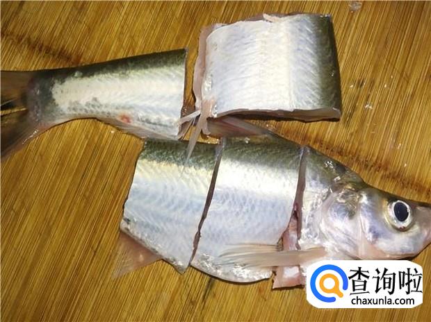 把清洗干净的鱼切成几块。