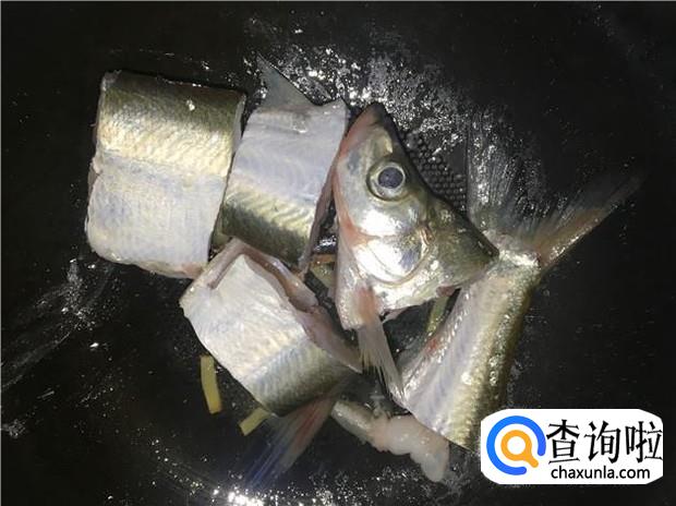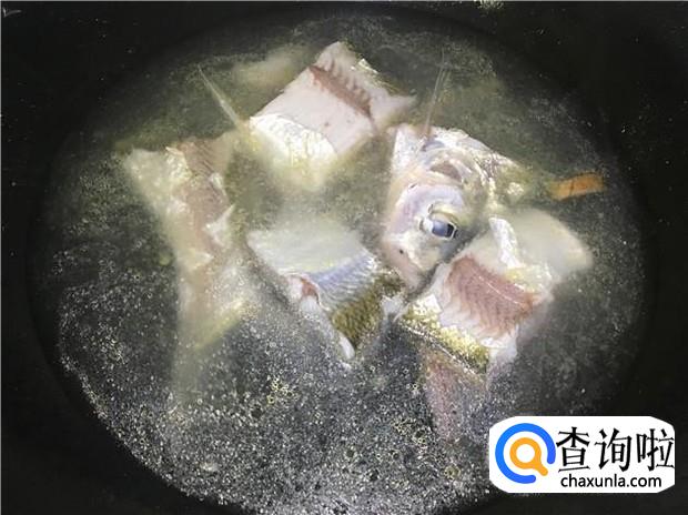 热锅下油,放入老姜煸香,然后放入鱼块,加入少许盐,把鱼煎几分钟。