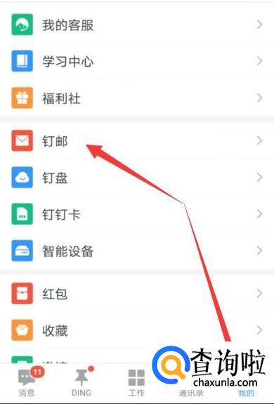 首先,登录钉钉,并在“我的”里找到“钉邮”点击进入,就可以进入到钉钉邮箱了。实际上钉钉邮箱并不需要主动开通,只要注册了钉钉帐号就拥有了自己的钉钉邮箱,默认的邮箱地址为:注册的姓名的小写拼写+手机尾号后四位+@dingtalk.com