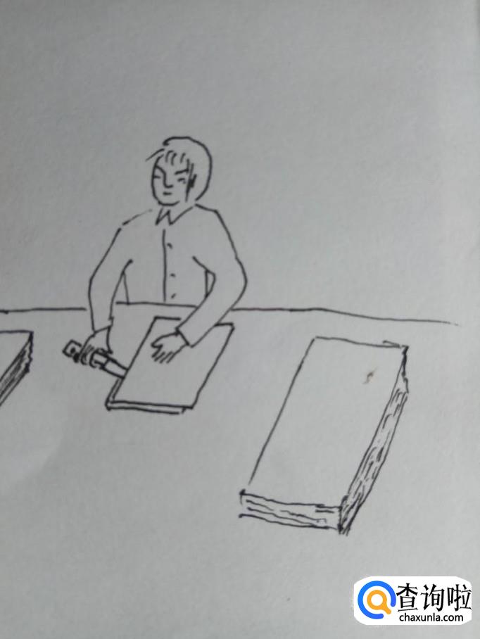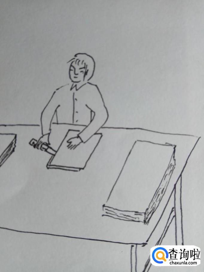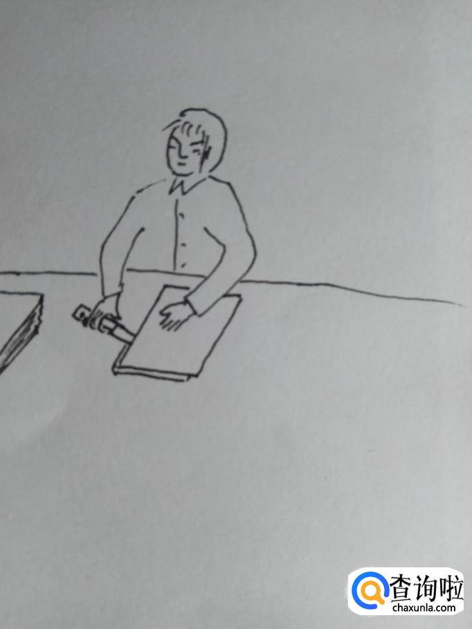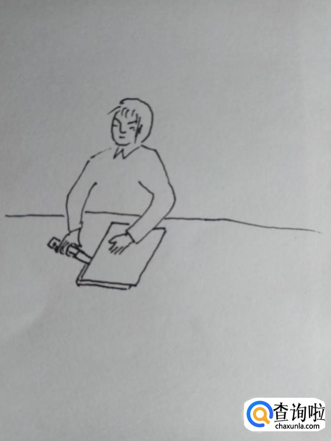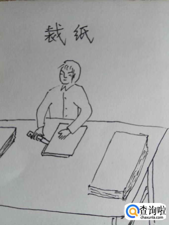 用一条线段画出纸的边缘,然后再画出裁纸人手里拿的一把刀。这把刀是比较薄一些的,这样便于裁纸。