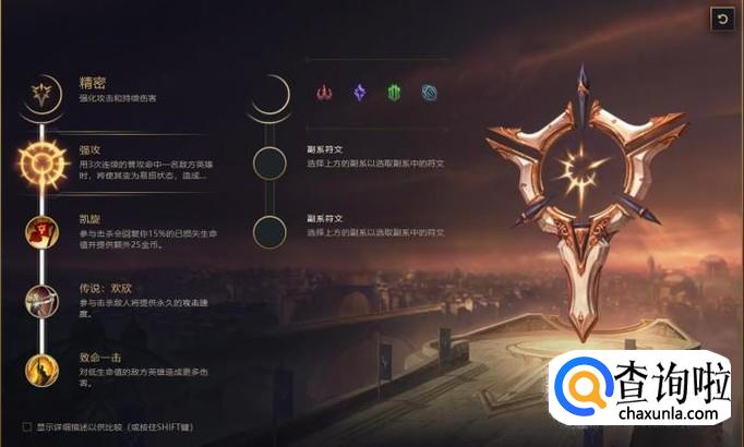 然后选择传说:欢欣和致命一击,这个天赋加上剑姬的被动破绽,能对敌方英雄造成大量伤害