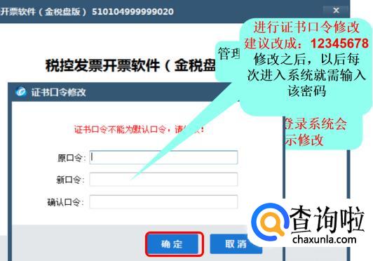 点击“登录”按钮后,系统弹出修改证书口令窗口,用户必须重新设置新的证书口令方可进入开票软件。为方便后期维护,证书口令可统一设置为12345678。