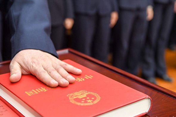 宣誓誓词内容如下:忠于中华人民共和国宪法,维护宪法权威,履行法定职责,忠于祖国、忠于人民,恪尽职守、廉洁奉公,接受人民监督,为建设富强民主文明和谐美丽的社会主义现代化强国努力奋斗。