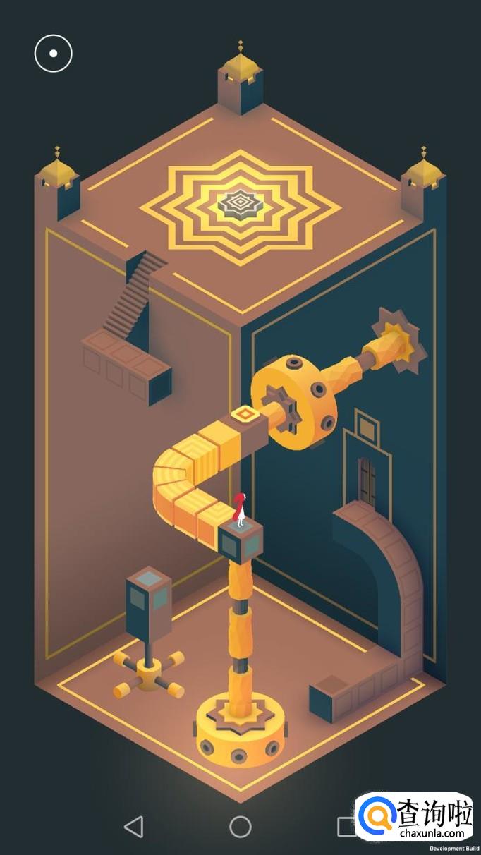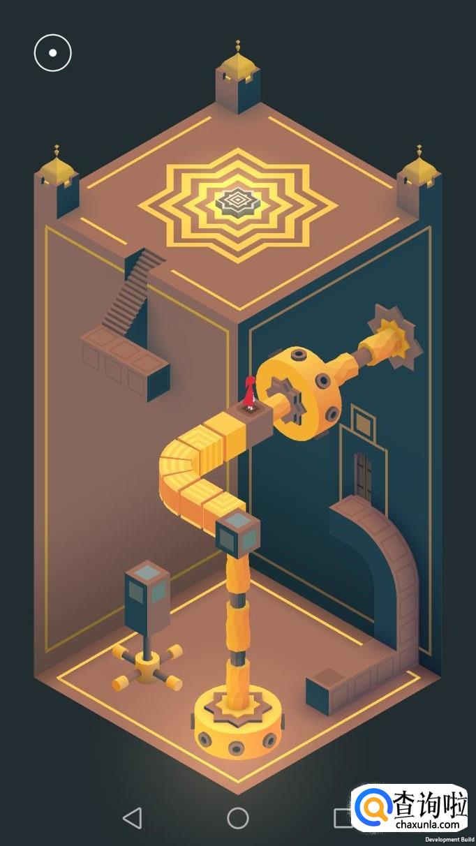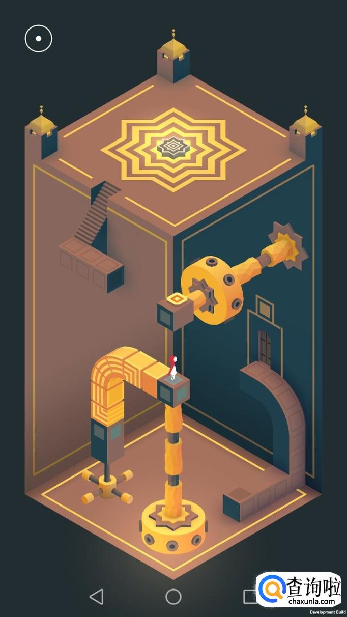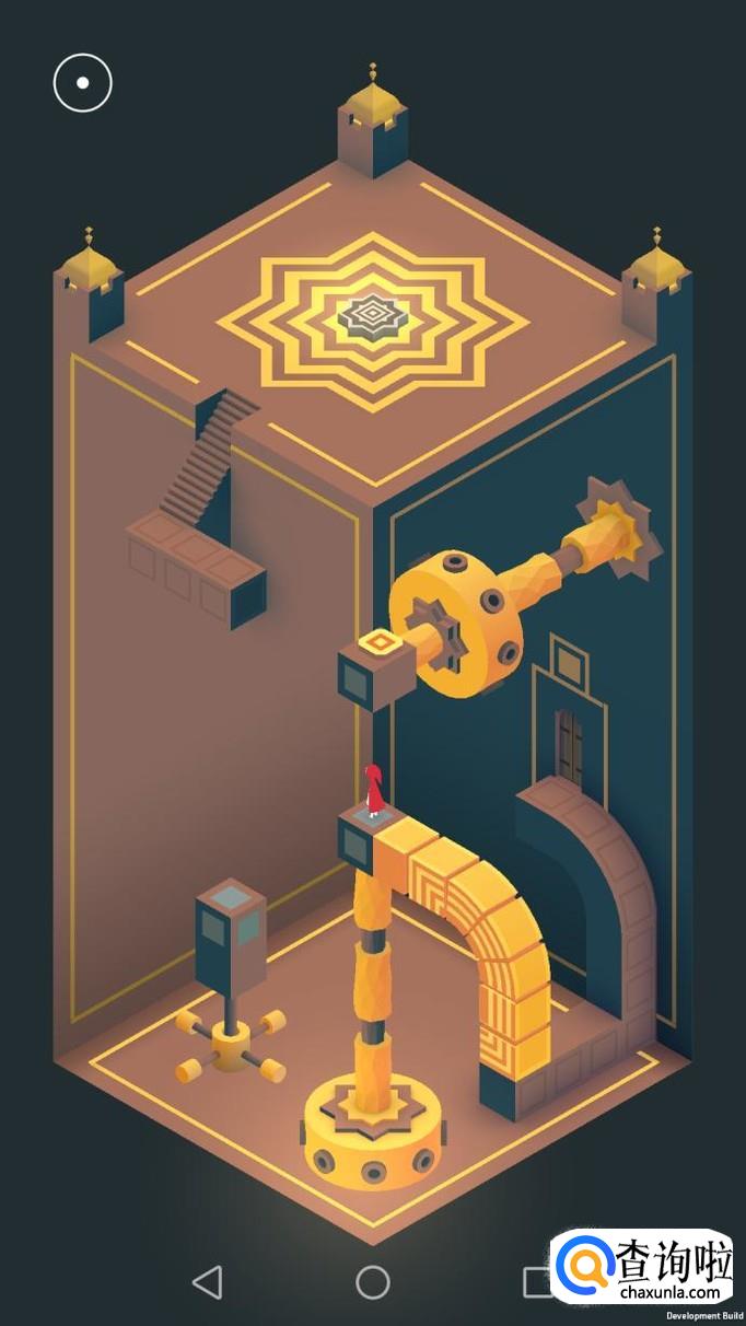 把右边的机关旋转180度,主角走到机关顶上,再把这个机关转回原处,然后把左边的机关向左转90度,再把上面的机关转到主角站脚处,主角就可以走过去踩黄色机关点。