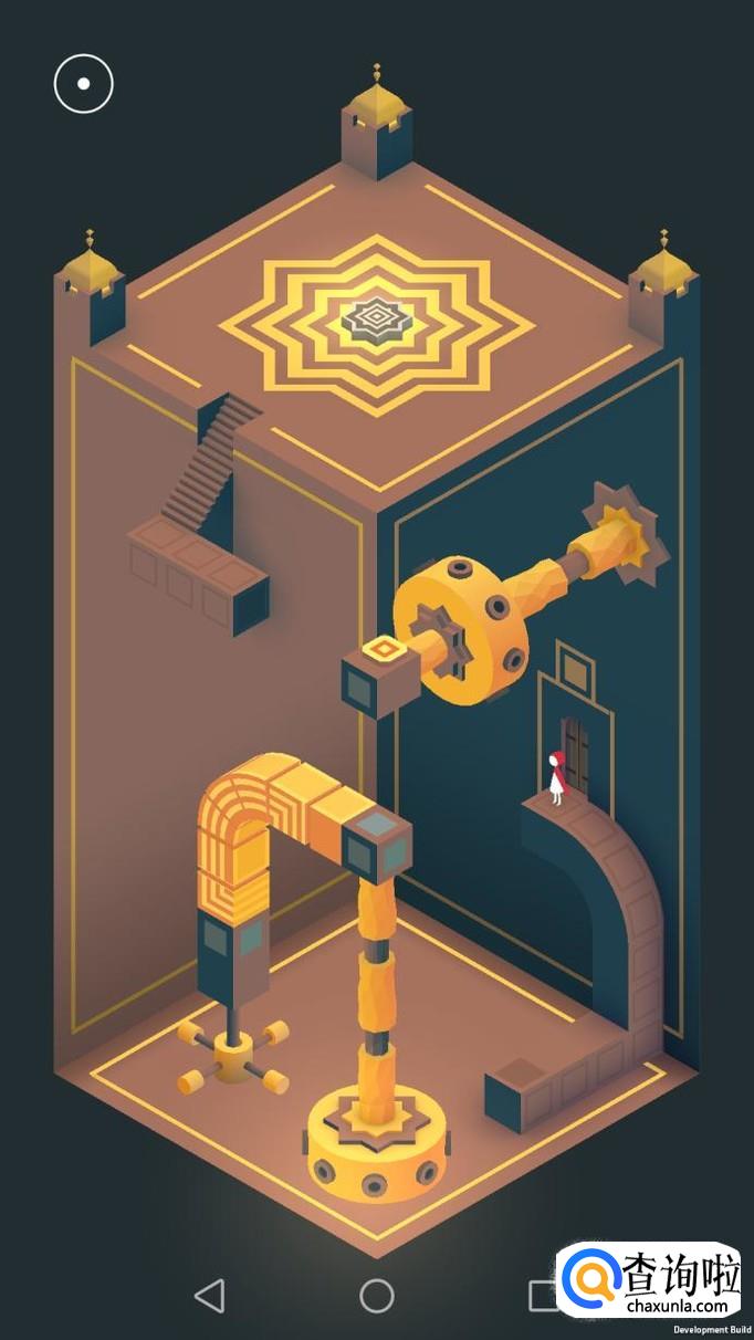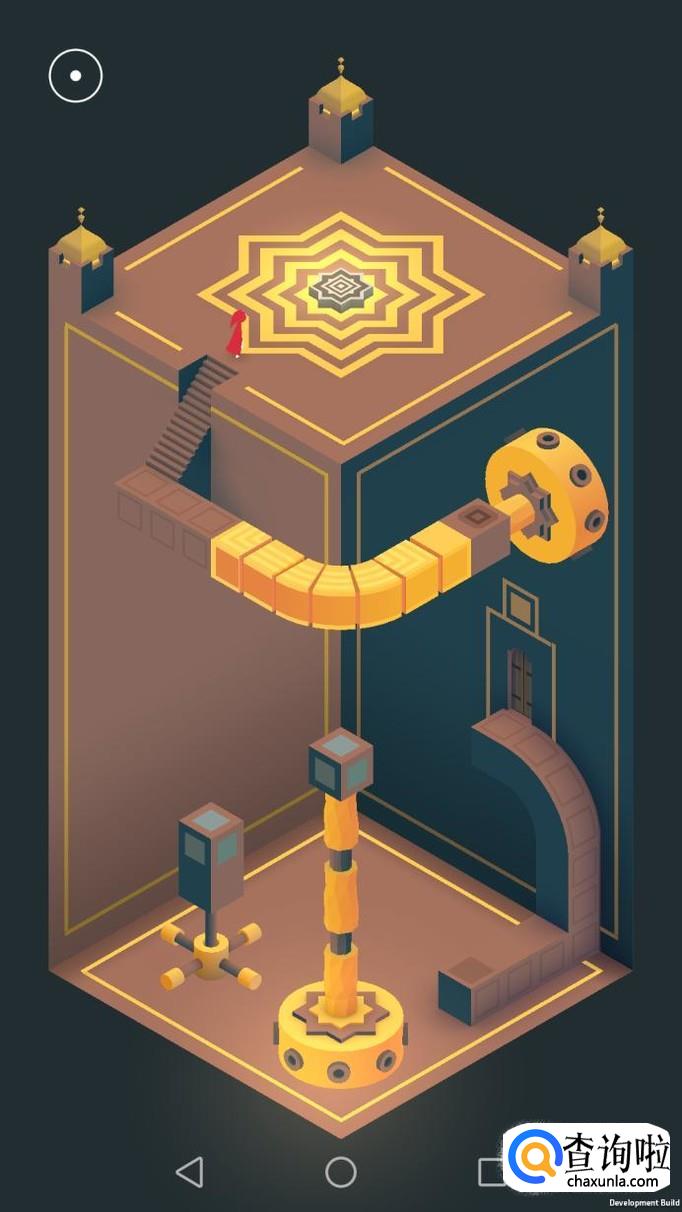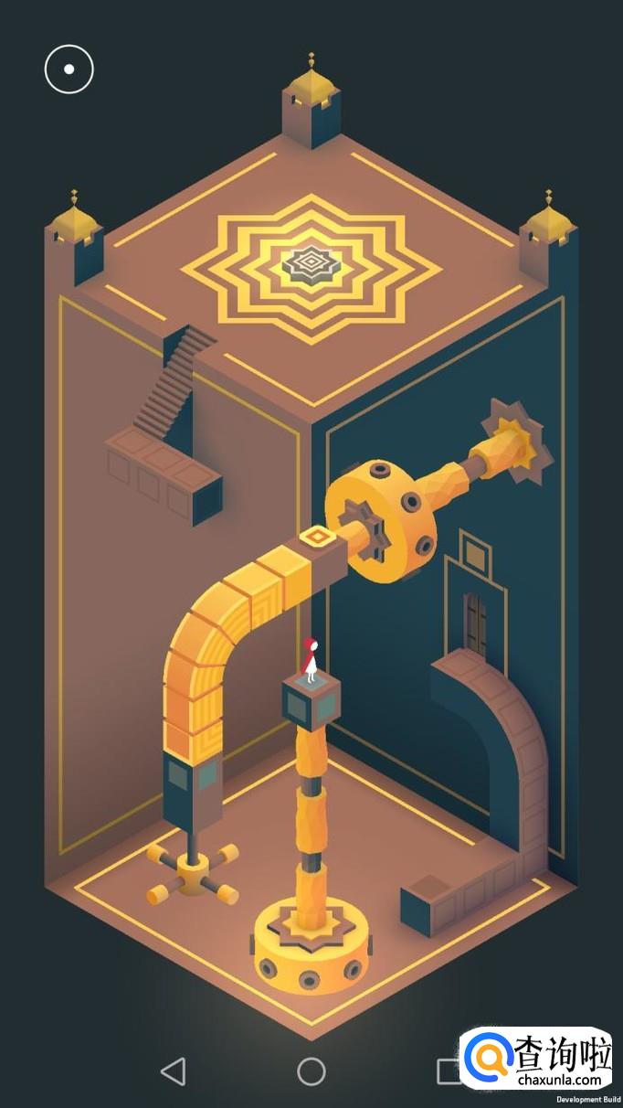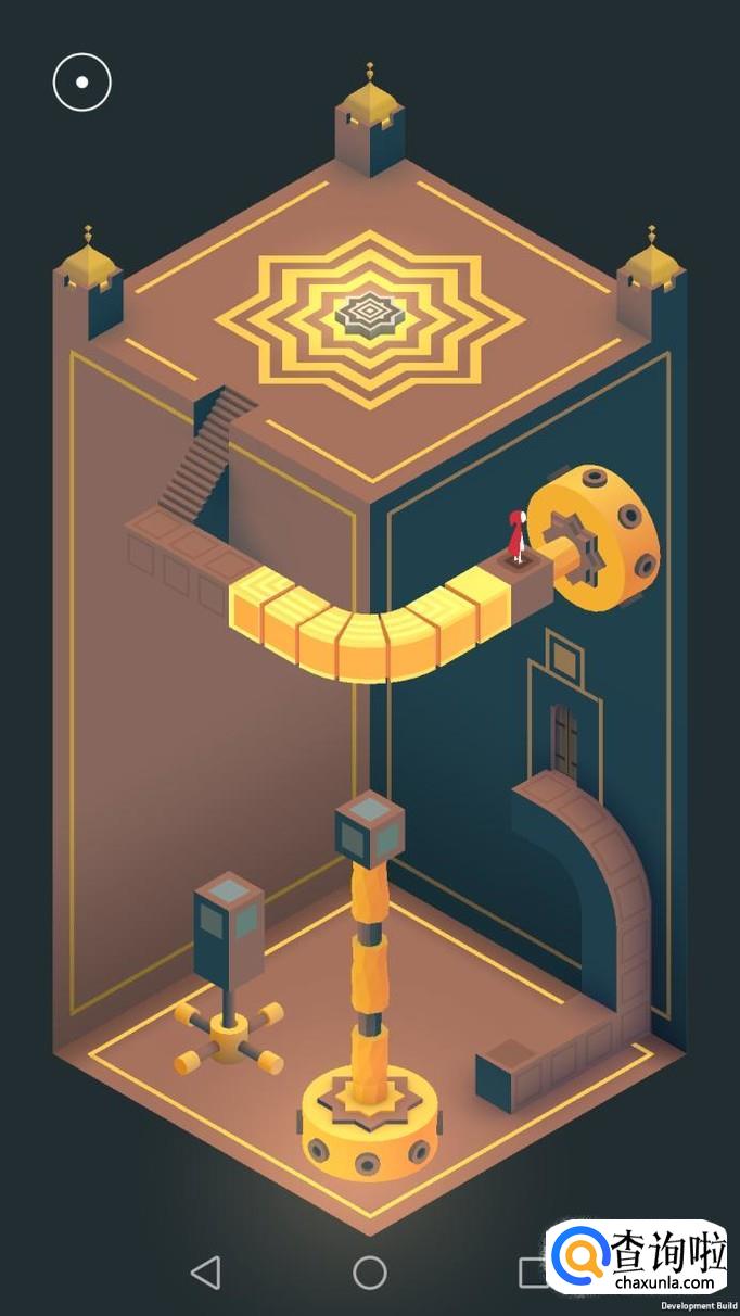 把右边的机关旋转180度,主角走到机关顶上,再把这个机关转回原处,然后把左边的机关向左转90度,再把上面的机关转到主角站脚处,主角就可以走过去踩黄色机关点。