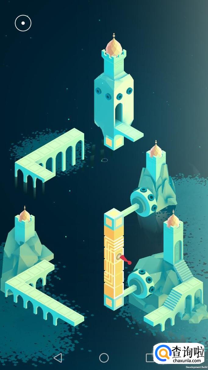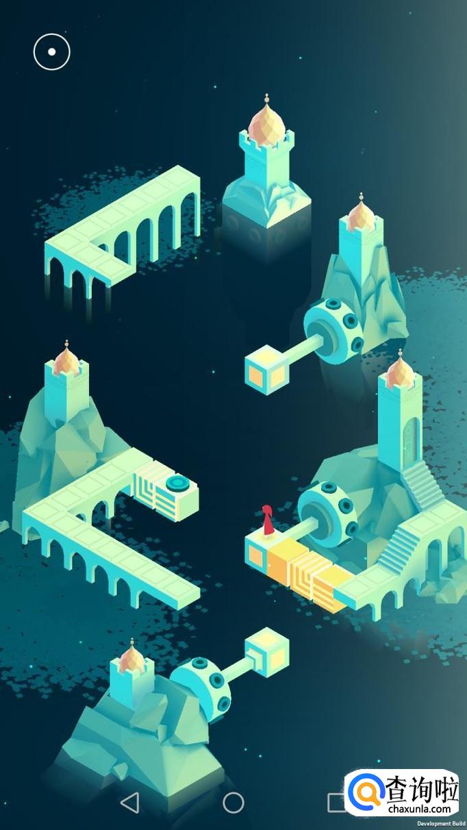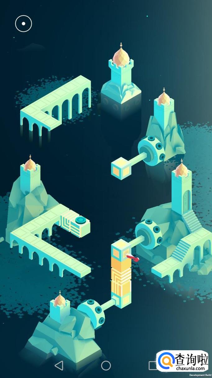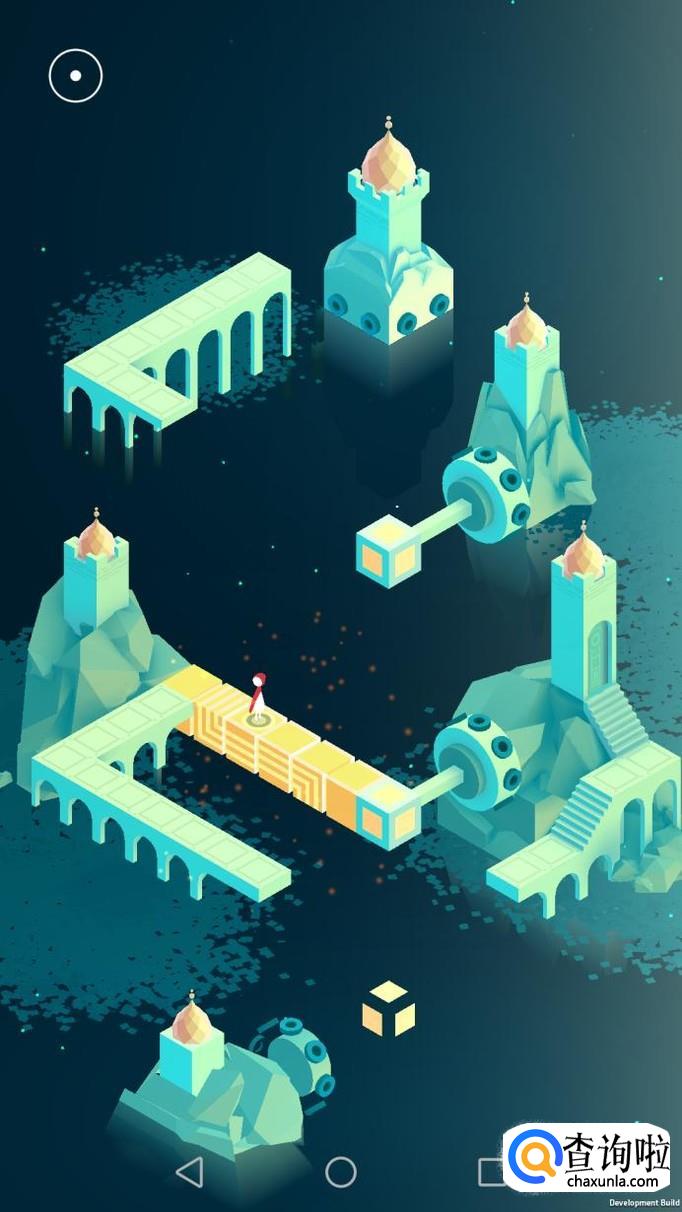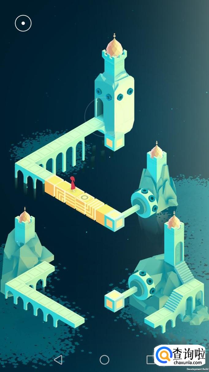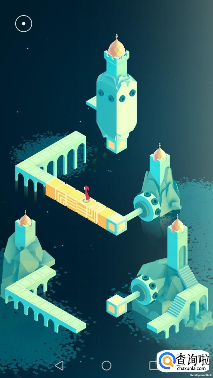 先把中间的机关向屏幕右转90度,使主角走到中间的机关上,再把中间的机关转回原处,使主角走到下面的机关上,下面的机关向左转90度,向前踩蓝绿色的机关点。