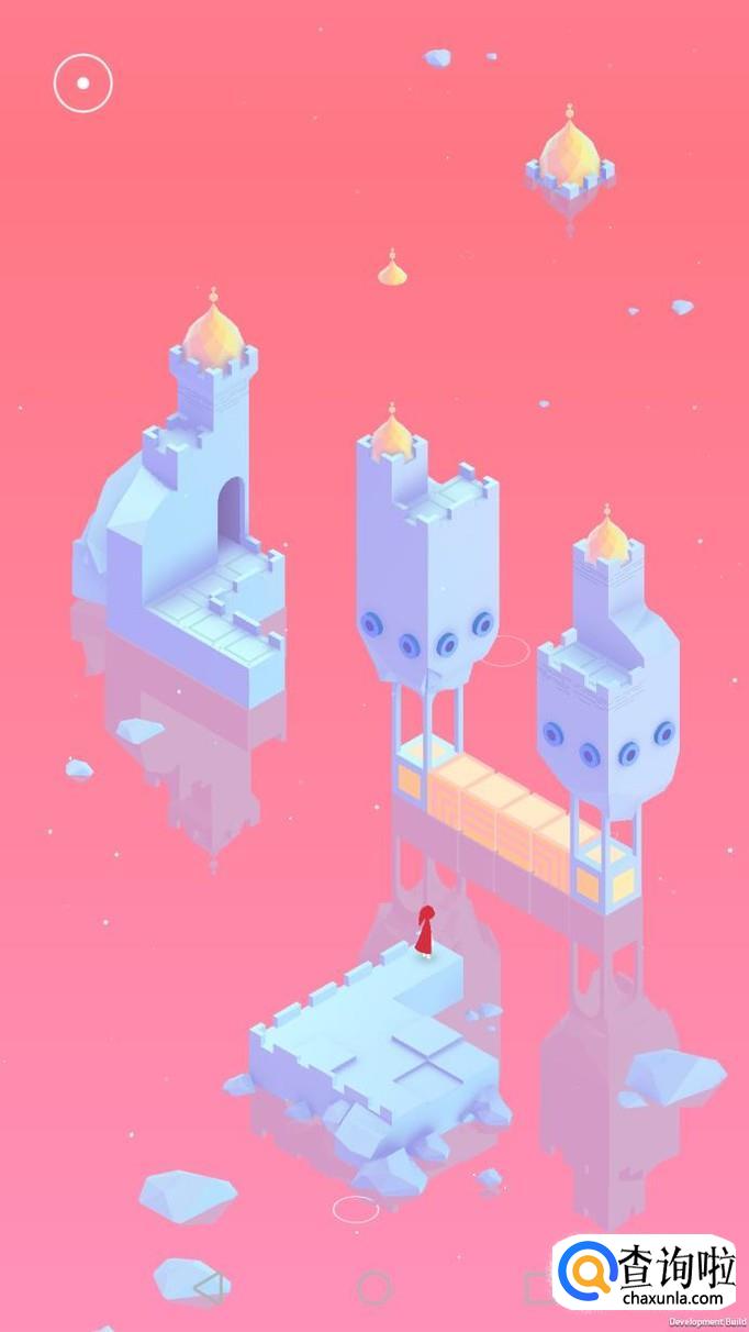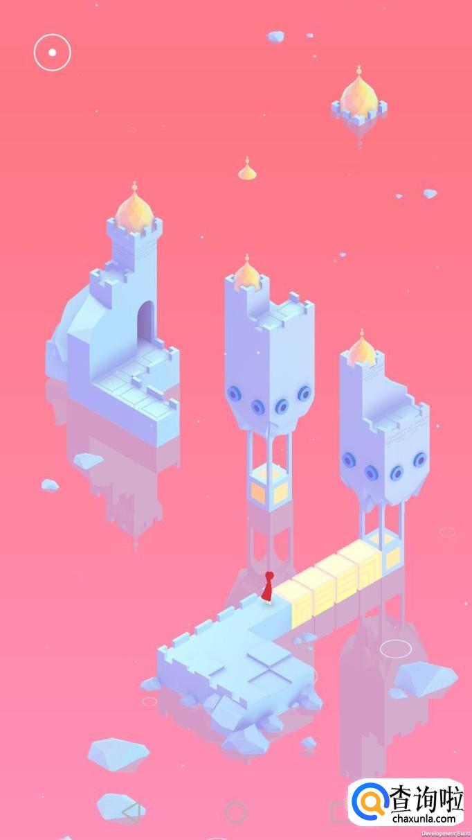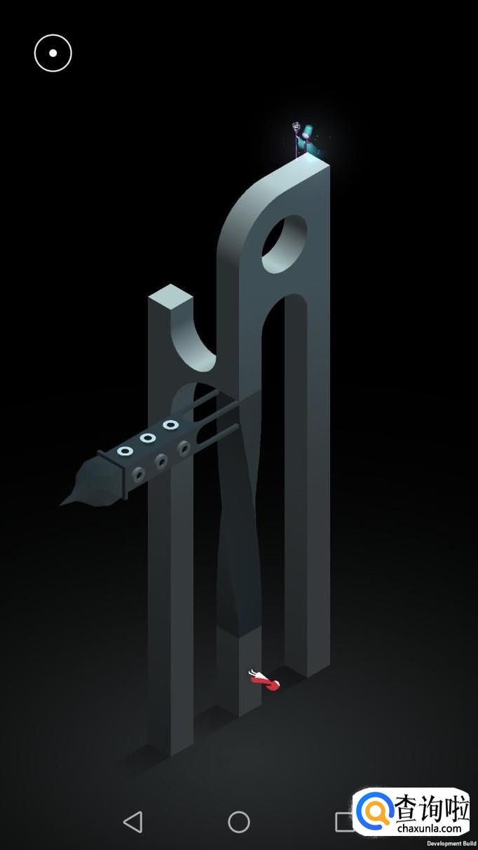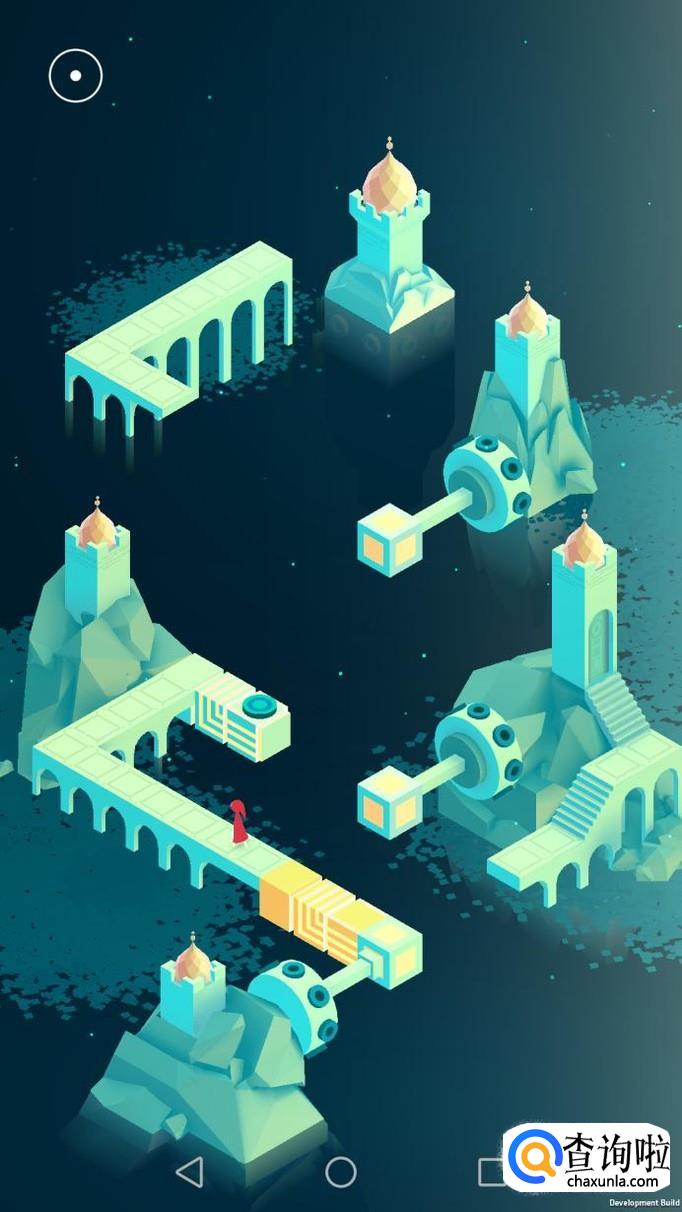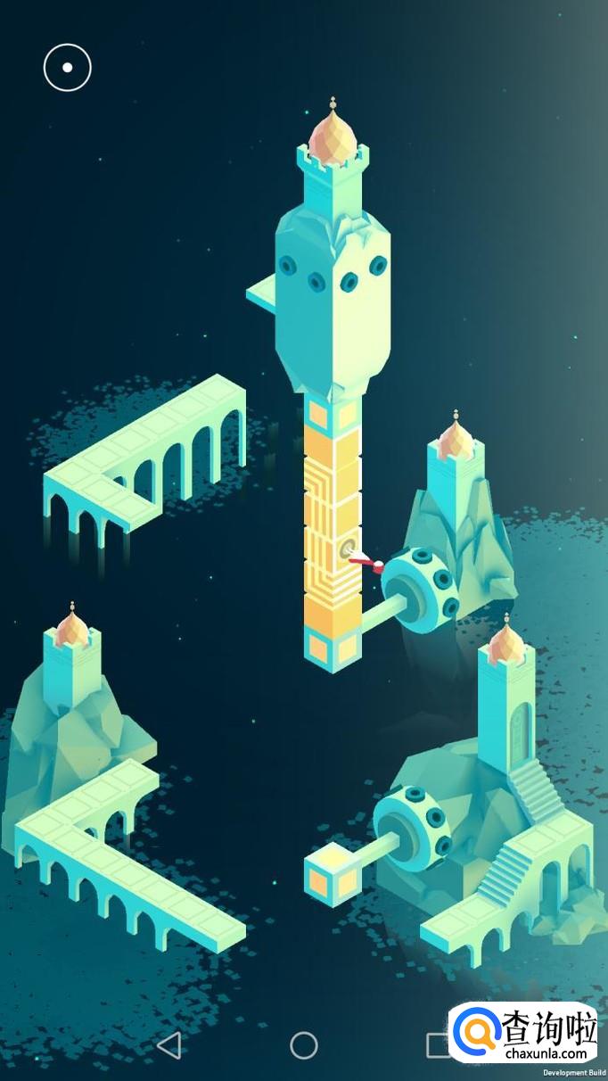 先把中间的机关向屏幕右转90度,使主角走到中间的机关上,再把中间的机关转回原处,使主角走到下面的机关上,下面的机关向左转90度,向前踩蓝绿色的机关点。