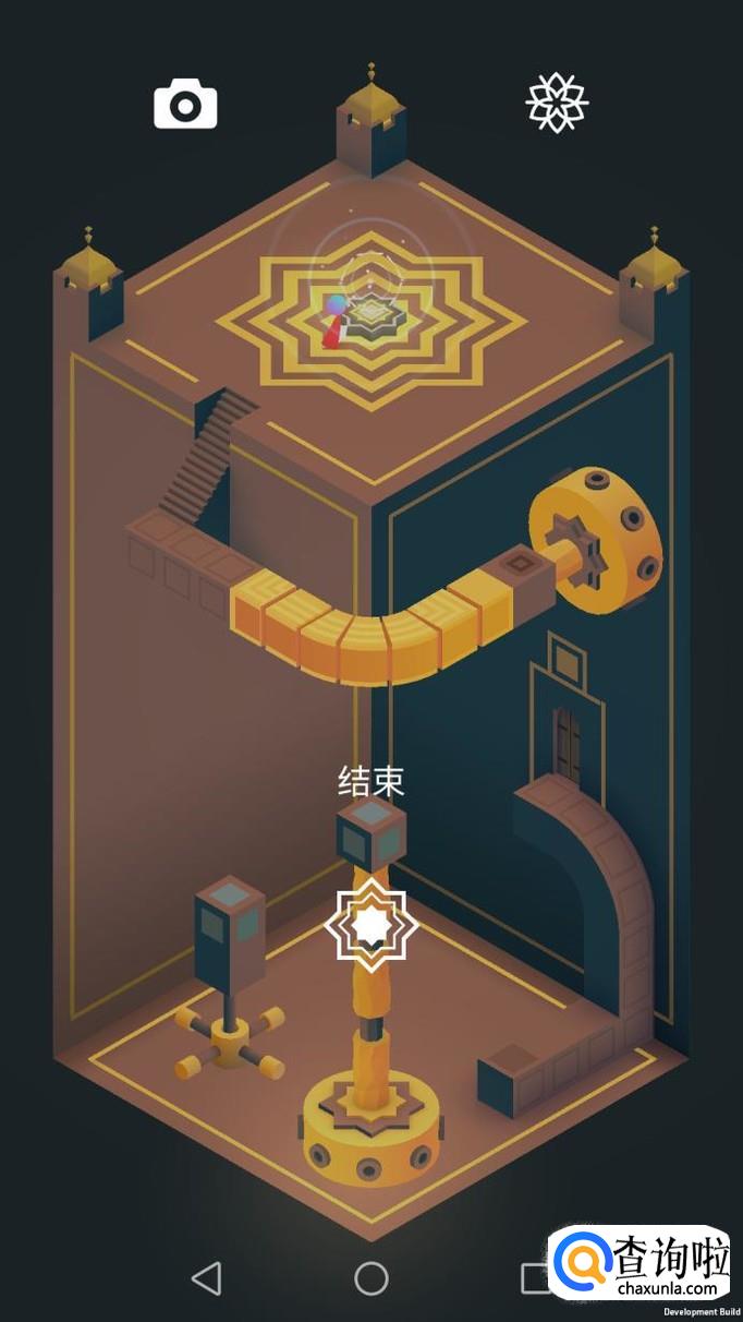 把上面的机关旋转180度使之与到终点的路相通,主角走到终点,用两只手指在屏幕滑动完成花纹,游戏通关。