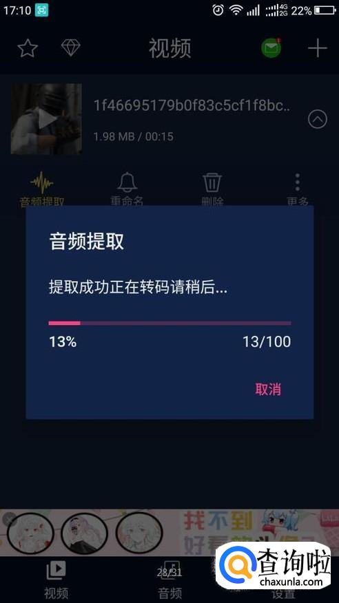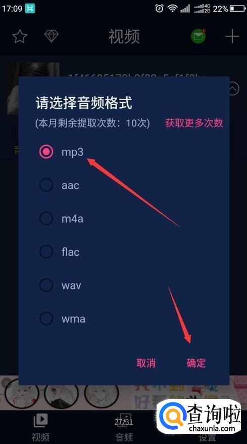 再点击音频提取按钮,弹出请选择音频格式,选择要提取成的格式。点确定。音频进入提取。