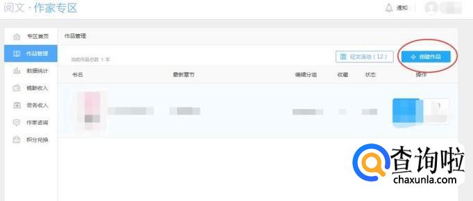 登录完成后,点击进入“作家专区”后可以看到如图右边有个“创建作品”,点击即可开始写小说创建个人作品。