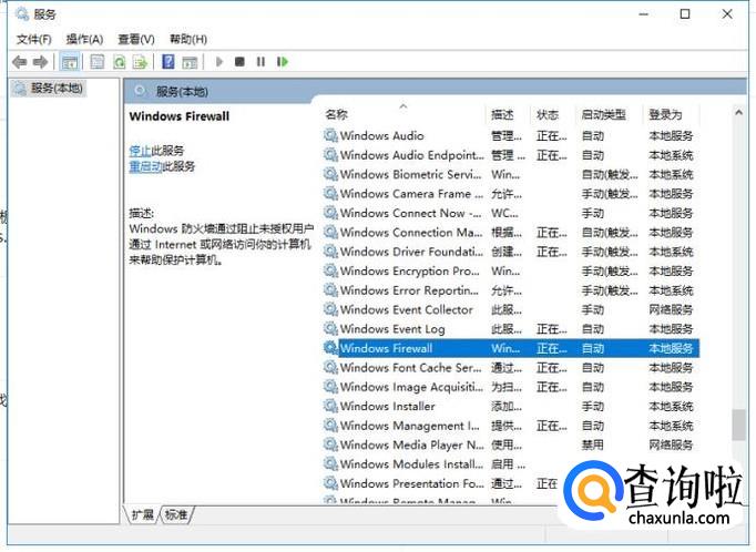 在“服务”控制面板中,找到Windows防火墙服务,“Windows Firewall”