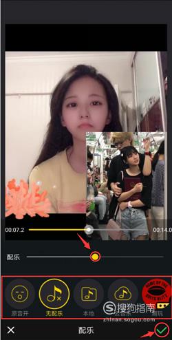 点击“音乐”可以为多格视频配上音乐,可以在本地中选择自己喜欢的音乐,也可以点击软件自带的配乐为视频添加音乐。通过调节横线上的黄色标点控制音量大小,设置完成后点击“√”。