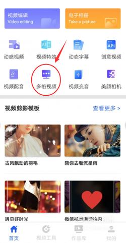 打开“清爽视频编辑器”,在首页中找到“多格视频”,点击进入视频导入页面。