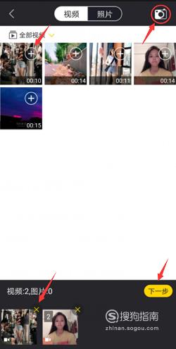 点击“+”导入需要添加的视频,点击“×”导出添加错误的视频,也可以点击右上角的“相机”图标现场拍摄,当视频导入成功后点击“下一步”。