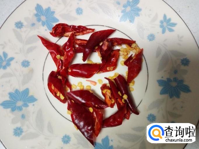 红干椒用水清洗干净,控干水分,斜刀切成段。