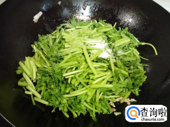 随即放入茼蒿,转大火快速翻炒,放入盐。炒至茼蒿断生,放入味精,关火出勺。
