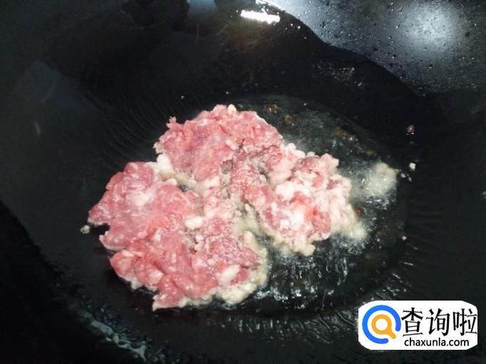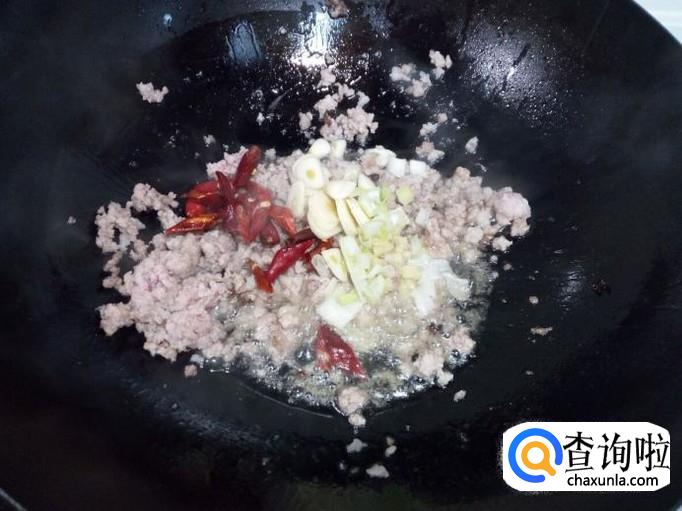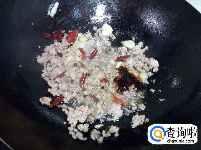 锅里放入油加热,油热后放入花椒爆锅,放入肉末,小火翻炒。