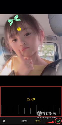 点击大小,可以进入贴纸大小设置页面,移动黄色竖线来控制贴纸的大小。当贴纸大小和样式设置完成后,点击右下角的“√”。
