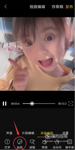在视频编辑页面有声音、片段编辑、高级编辑、设置四个模块,找到高级编辑模块中的“贴纸”功能并点击。