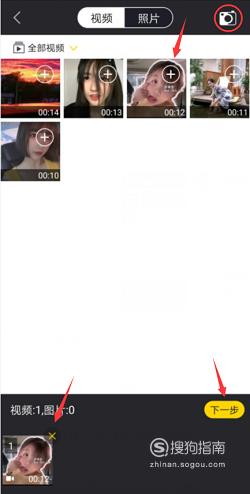 在视频导入页面,导入需要添加贴纸的视频进行编辑,可点击视频中的“+”导入,点击“×”导出添加错误的视频。也可以点击右上角的“相机”图标现场拍摄。添加成功后点击“下一步”。