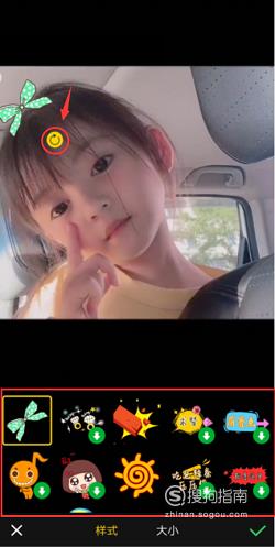 在贴纸样式选择页面中,有很多可爱的贴纸可以选择,点击即可添加到视频中,按住黄色标点,可以调节贴纸的大小和方向。