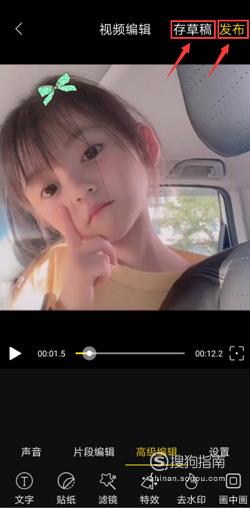 返回视频编辑页面后,点击“存草稿”将设置完成后的视频保存至手机,点击“发布”可快速分享给好友。
