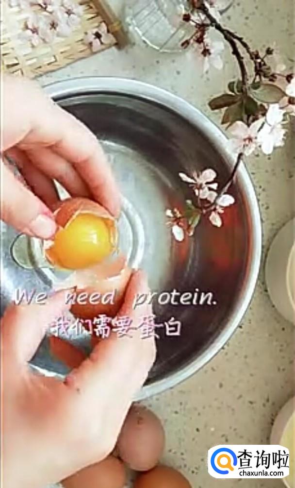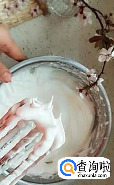 分离鸡蛋清,然后分三次加入白糖,打发至小尖头的样子,如下图