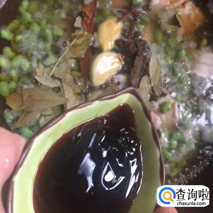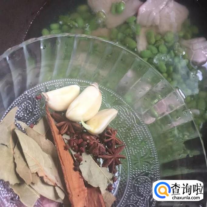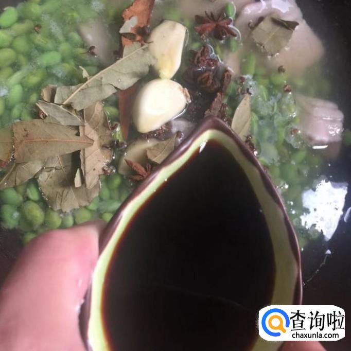 食材:五花肉,清水,毛豆,桂皮,八角,香叶,蒜头,花椒,酱油,蚝油,白砂糖。