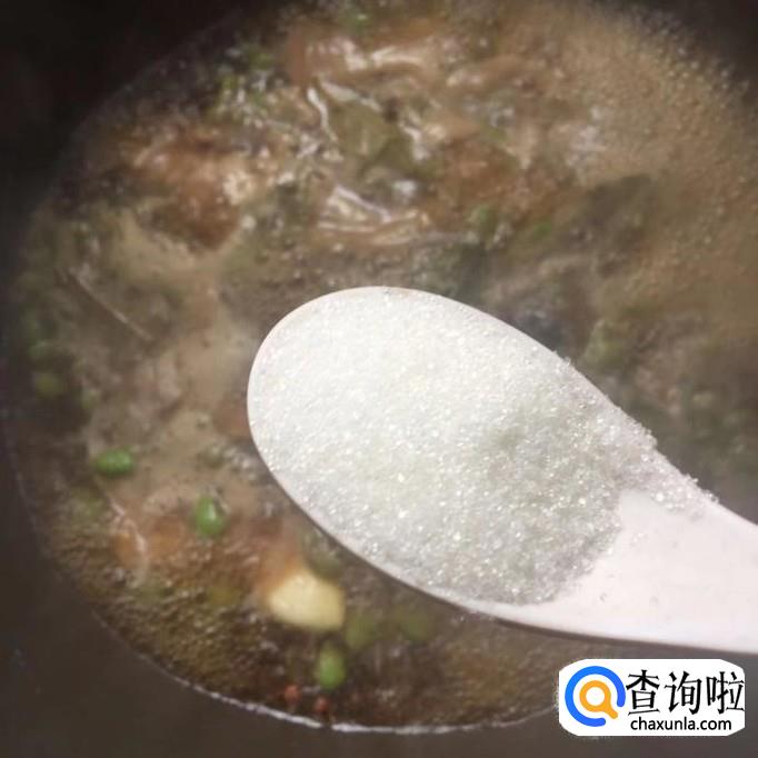 然后往锅中加入一勺的白砂糖,开小火慢慢卤半个小时,如下图所示。小贴士:1.白砂糖能够达到提鲜的效果,大家不要忘记放了哦。2.等到锅中的水份所剩无几了,就可以开大火收汁了。