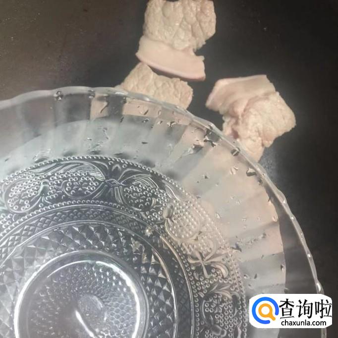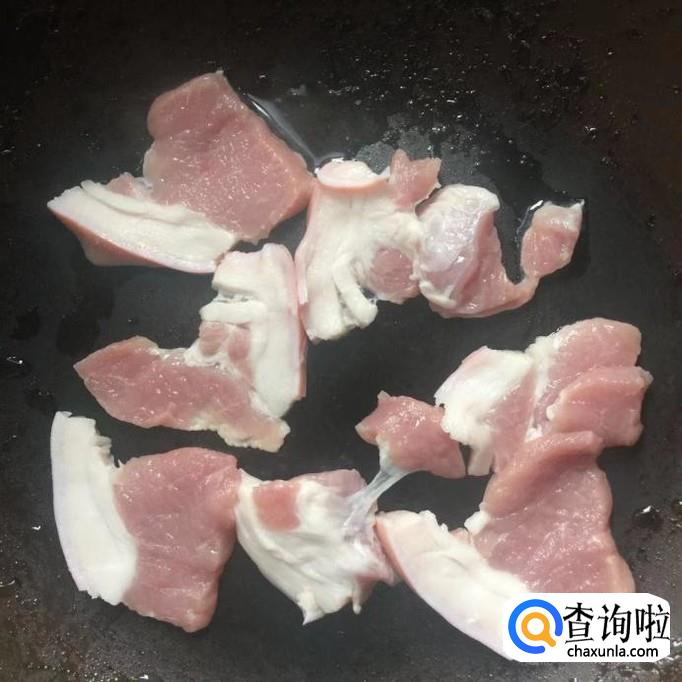 首先将买回来的五花肉洗干净切成片,倒入锅中煸炒三分钟,如下图所示。小贴士:等到五花肉的猪皮略呈焦黄色就可以了。