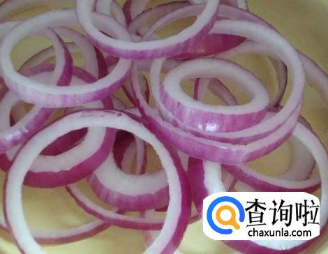 将洋葱剥去外面的干皮,洗净后,用刀切成宽度一样的圈。