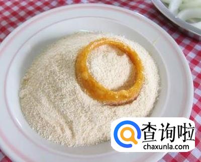 再将洋葱圈放在面包糠上,蘸上面包糠。