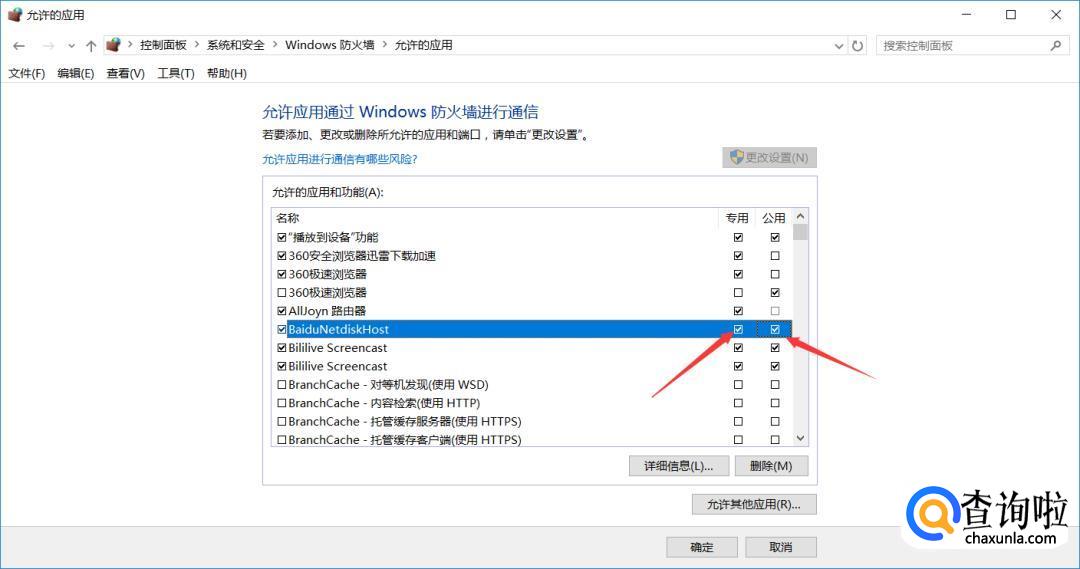 在允许的应用里点选更改【设置】找到百度网盘选项,在两个框中都选上【√】。如果【确定】是灰色的不能点击就需要点击右上角的【更改设置】来修改。