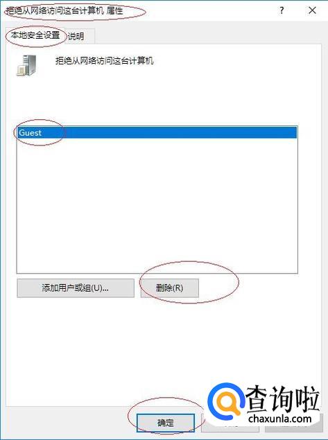如图所示,弹出"拒绝从网络访问这台计算机 属性"对话框。选择"本地安全设置→Guest"账户,点击"删除"按钮。