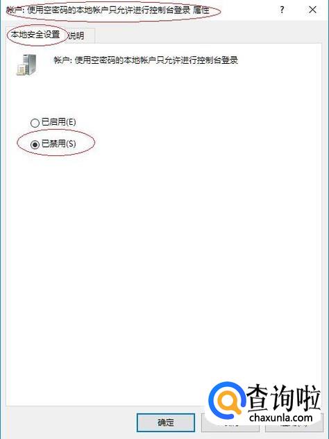 如图所示,弹出"账户:使用空密码的本地账户只允许进行控制台登录 属性"对话框。勾选"本地安全设置→已禁用"单选框,本例到此希望对大家能有所帮助。
