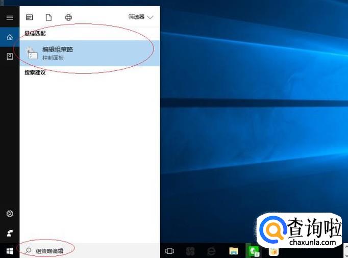 如图所示,搜索框输入"组策略编辑"。Cortana(小娜)显示搜索结果,点击"最佳匹配→编辑组策略"项。