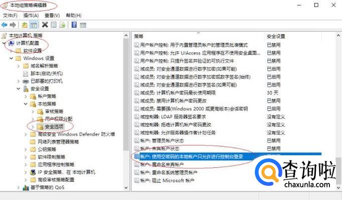 展开左侧"本地计算机策略→计算机配置→Windows 设置→安全设置→本地策略→安全选项"目录,如图所示。拖动右侧垂直滚动条,鼠标双击"账户:使用空密码的本地账户只允许进行控制台登录"项。
