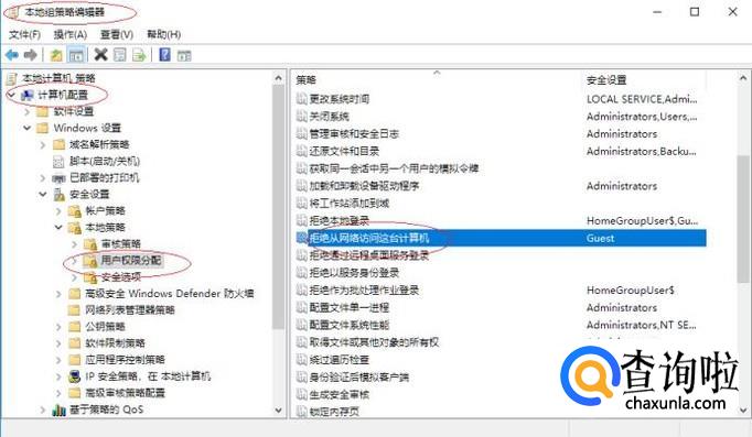唤出"本地组策略编辑器"程序窗口,如图所示。展开左侧"本地计算机策略→计算机配置→Windows 设置→安全设置→本地策略→用户权限分配"目录,双击右侧"拒绝从网络访问这台计算机"项。