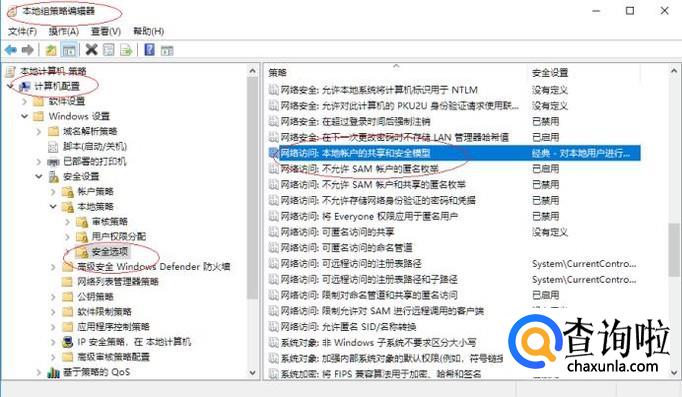 展开左侧"本地计算机策略→计算机配置→Windows 设置→安全设置→本地策略→安全选项"目录,如图所示。拖动右侧垂直滚动条,鼠标双击"网络访问:本地账户的共享和安全模型"项。