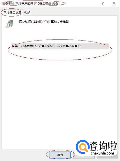 如图所示,弹出"网络访问:本地账户的共享和安全模型 属性"对话框。点击"本地安全设置"文本框向下箭头,选择"经典-对本地用户进行身份验证,不改变其本来身份"项。