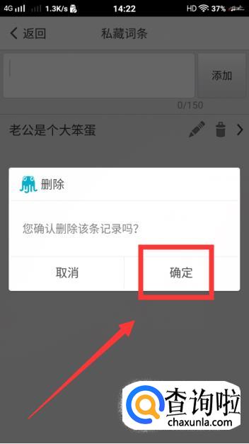 点击之后,就有一个垃圾箱的图标,点击之后,会弹出一个删除的小框框,点击【确定】,这样就将这条词条删除啦。