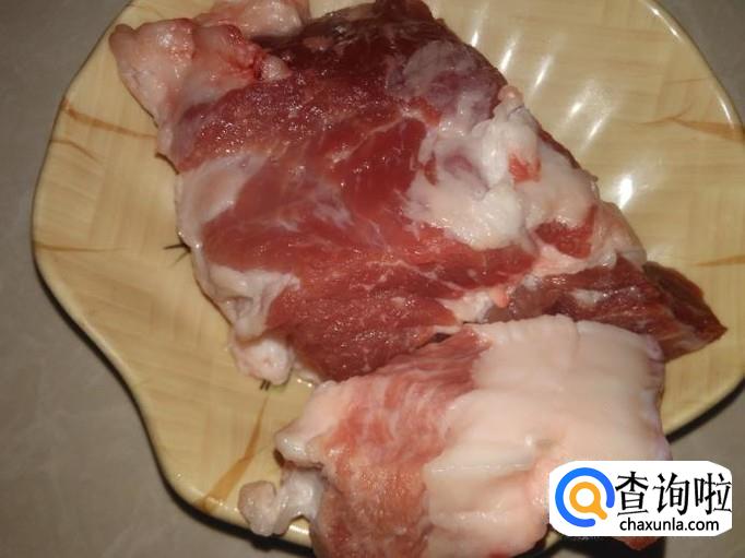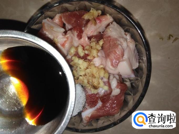 把猪肉切成厚片,然后加适量的盐、姜蓉。