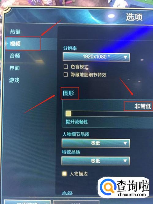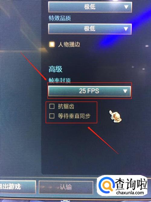 还有另外一个方法,首先打开英雄联盟,进入游戏,点击“esc”选择“视频”选项,将其中的“图形”设置为非常低,然后下滑将“帧率封顶”调成25FPS,注意不要勾选“抗锯齿”和“等待垂直同步”两个选项。