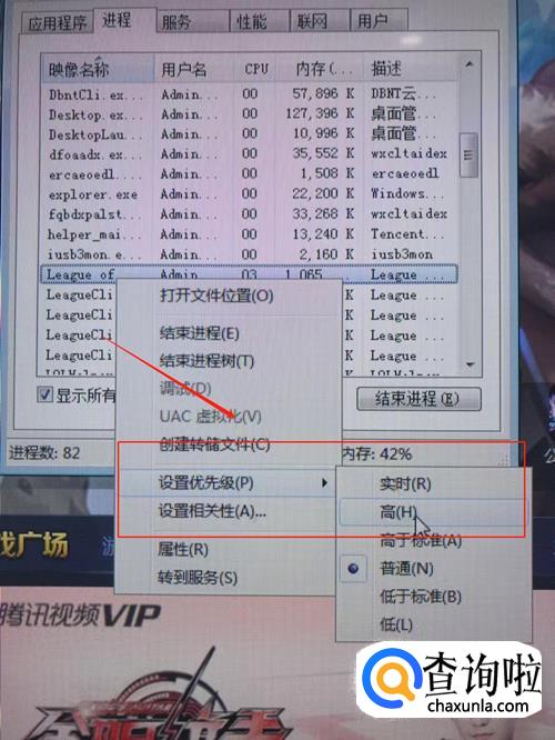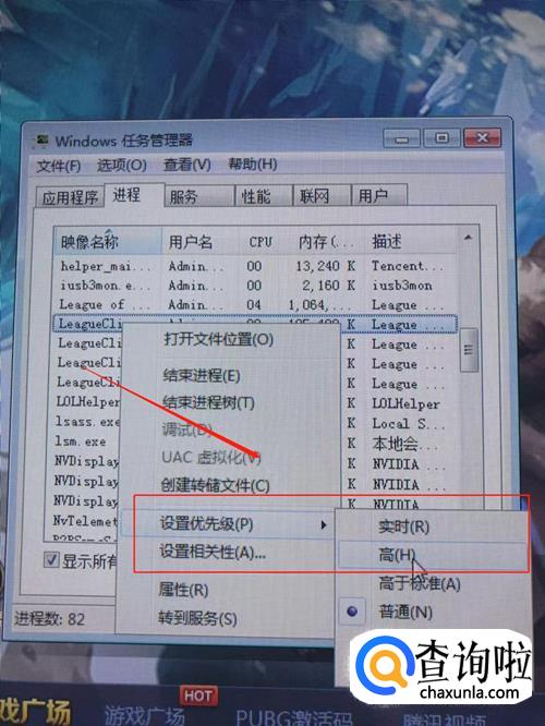 然后返回桌面,打开任务管理器,右键点击进程中的“lolclient.exe”,然后点击设置优先级,将优先级设置为高,接着同样将“lol.launcher”的优先级也设置为高。完成以上操作后,英雄联盟玩起来肯定会变的更加顺畅。