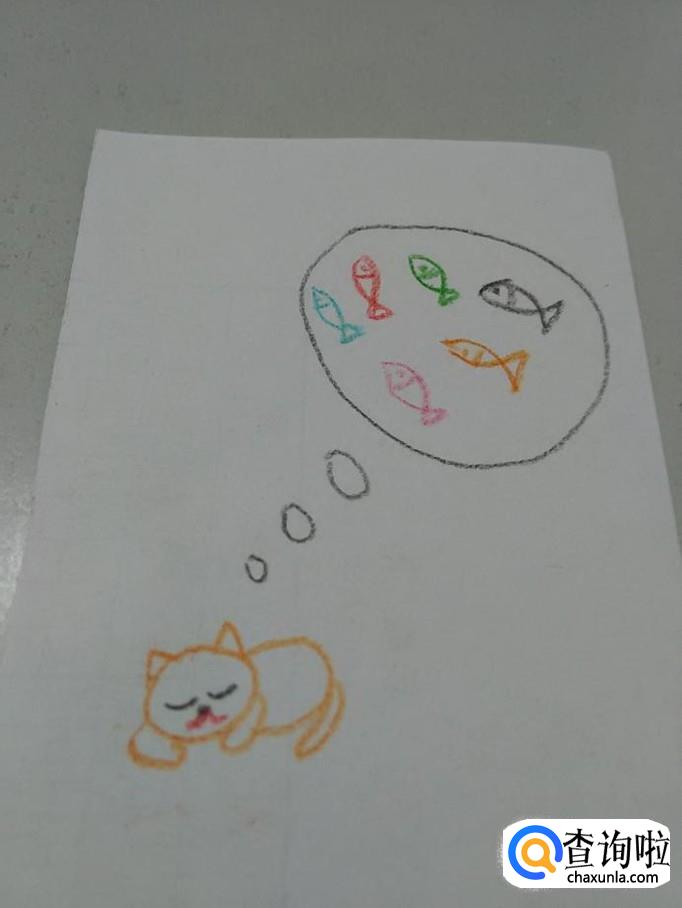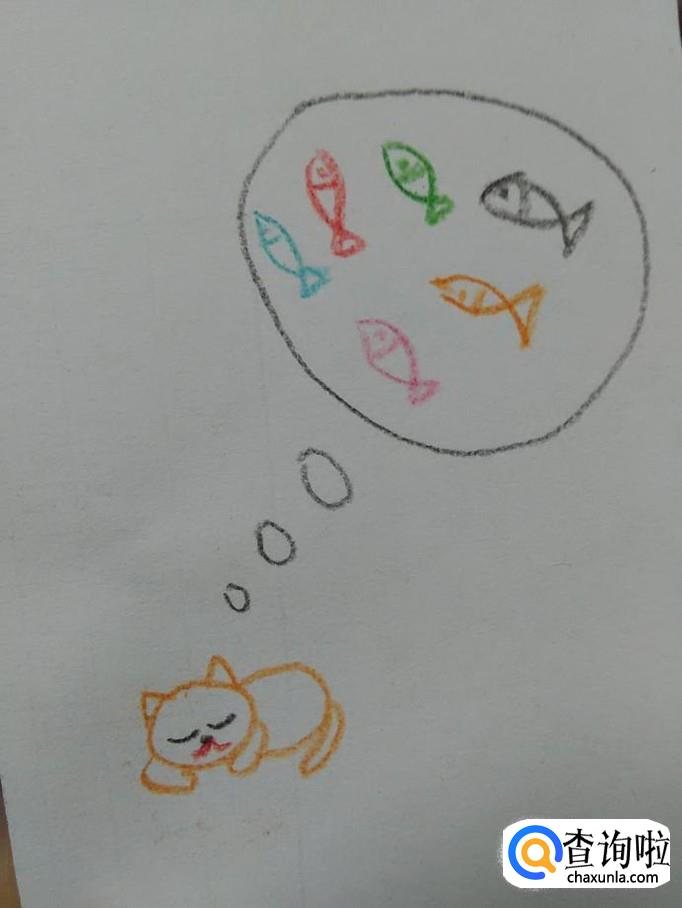 用同样的方法,再用红色、粉色、绿色、桔色、黑色各画一条小鱼,表示小猫正在梦见许多彩色的小鱼,这就是小猫的彩色的梦。