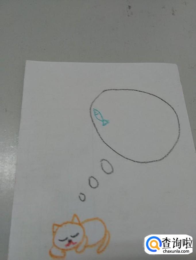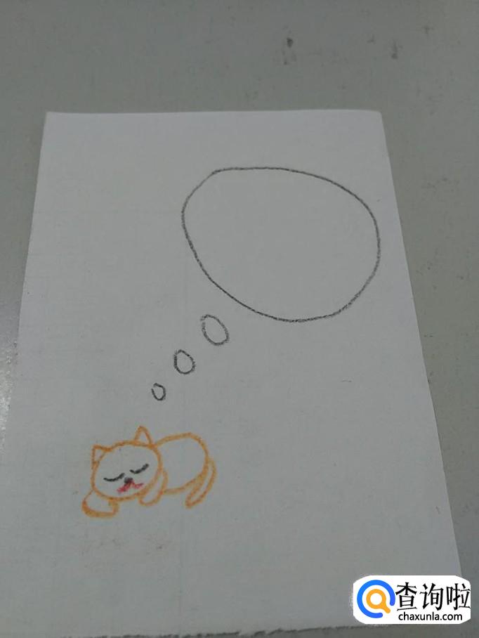 从小猫头顶向右上方画三个小小的椭圆形和一个大大的椭圆形,表示正在做梦。