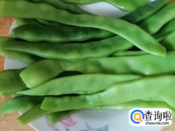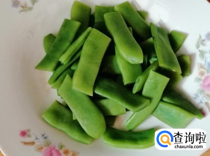 取适量新鲜的绿芸豆,把绿芸豆摘洗干净,煮锅放水,水开后把洗好的绿芸豆放入锅中,烫3-5分钟就可以了,把烫好的绿芸豆,捞出放凉切好待用。